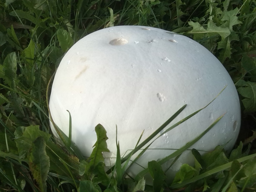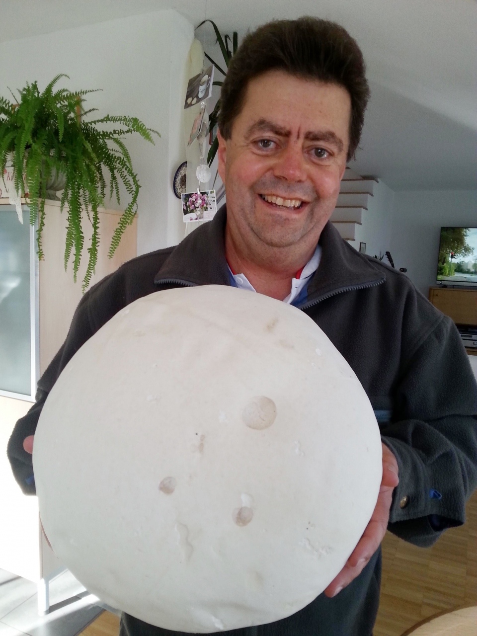 Der Riesenbovist (Langermannia gigantea) misst stolze 33 Zentimeter. "Er hat nur ganz knapp in meine mitgebrachte Stofftasche gebracht", erzählt der Finder, der auch in seiner Freizeit ab und zu Pilze sucht. "Ich komme nur leider viel zu wenig dazu."