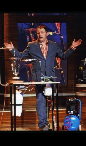 Jetzt wechselt er vom Bildschirm wieder auf die Bühne. Doch er kommt nicht alleine! Neben einem Lieferwagen mit Prototypen bringt er als Unterstützung auch gleich sein „Innovationsorchester“ mit.