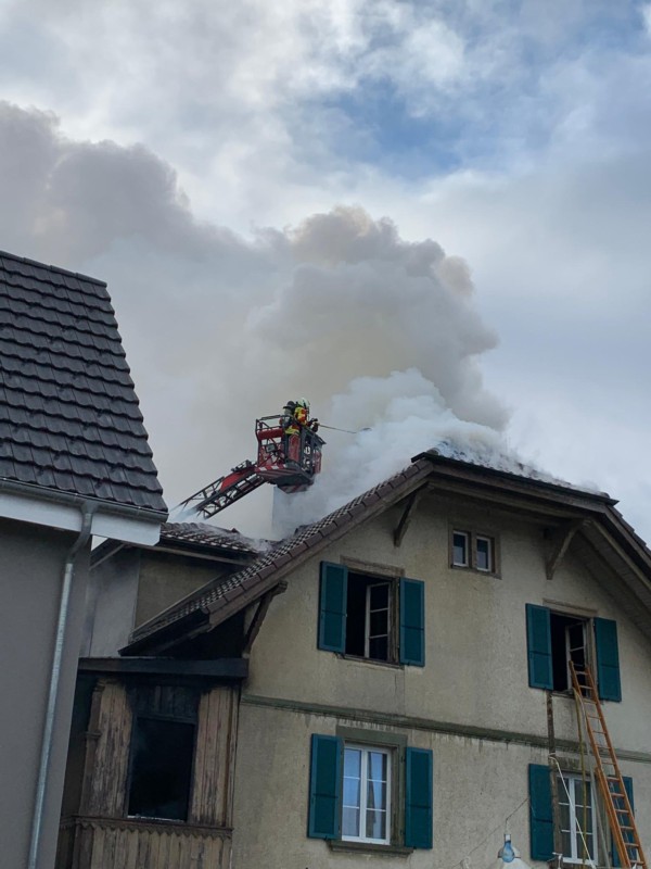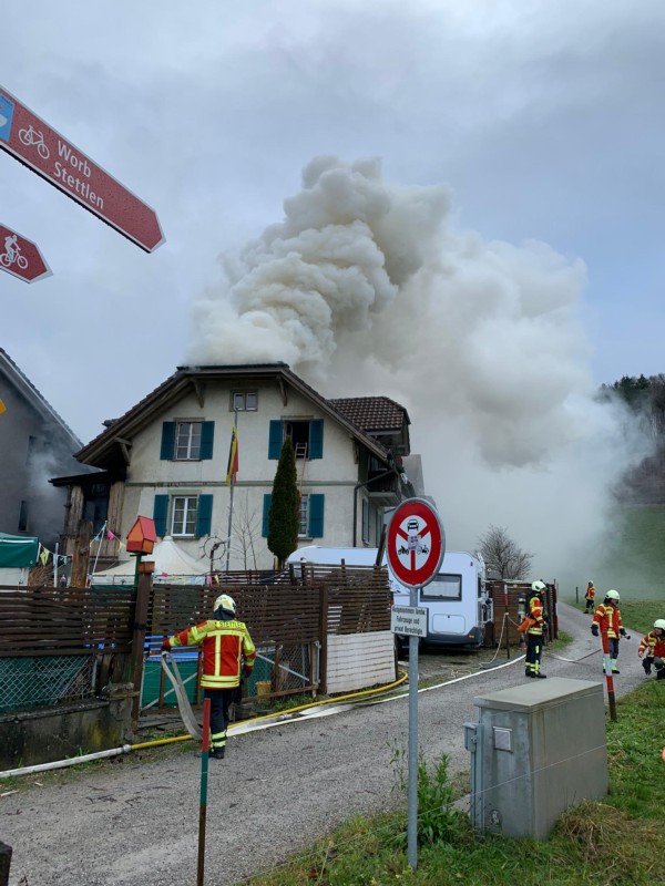 Die sofort alarmierten Einsatzkräfte stellten beim Eintreffen vor Ort fest, dass Flammen aus den Obergeschossen schlugen. Die insgesamt rund 65 Angehörigen der Feuerwehren Stettlen, Vechigen und Ostermundigen sowie die Berufsfeuerwehr Bern konnten den Brand im Innern des Gebäudes lokalisieren, unter Kontrolle bringen und schliesslich löschen.