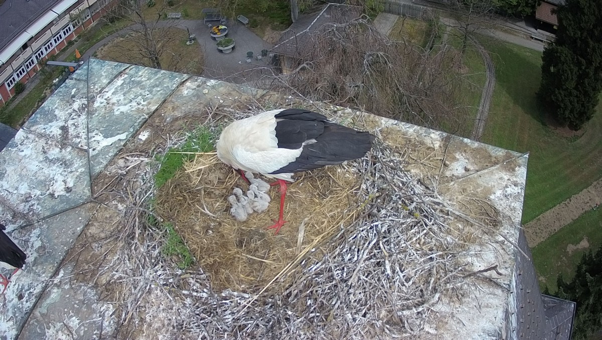 Fast pünktlich auf Ostern schlüpften die fünf Jungen auf dem Dach des PZM. Während der eine der erwachsenen Störche fleissig die fünf Eier warmhält, verschwindet der andere hin und wieder auf Futtersuche. Die restliche Zeit hält er Wache - auf einem Bein. Mit einem speziellen Schnappgelenk am «Knie» rasten Störche das Bein kerzengerade ein. Somit können sie ohne Muskelkraft auf einem Bein ruhen. Das zweite ziehen sie dabei nahe an den Körper, um über die lange, unbedeckte Fläche möglichst wenig Wärme zu verlieren.
