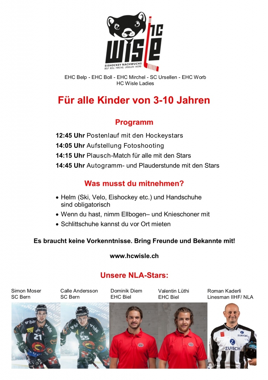 Auch in diesem Jahr veranstaltet der HC Wisle am Sonntag, 05.11.2017 gemeinsam mit den Partnervereinen EHC Belp, Boll, Mirchel, SC Ursellen und EHC Worb den Swiss Ice Hockey Day!