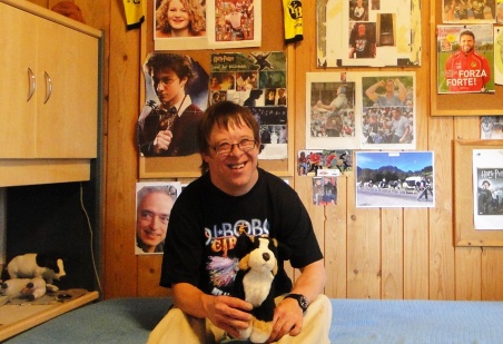 Ruchs Zimmer im Sonnenbühl ist sehr ordentlich. An der Wand hängen Zeitungsausschnitte und Poster von Schwingern und Berner Sennenhunden, von DJ Bobo, von Lena Meyer-Landrut und von Harry Potter. Eine ganze Ecke ist YB gewidmet. "Leider verlieren sie immer", sagt Ruch. Von Harry Potter möge er gern die Filme. Auch James Bond und Batman schaue er immer mal wieder auf seinem Laptop.
