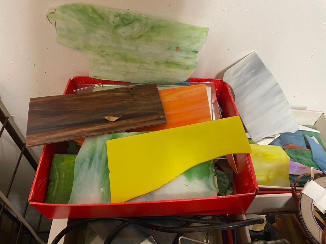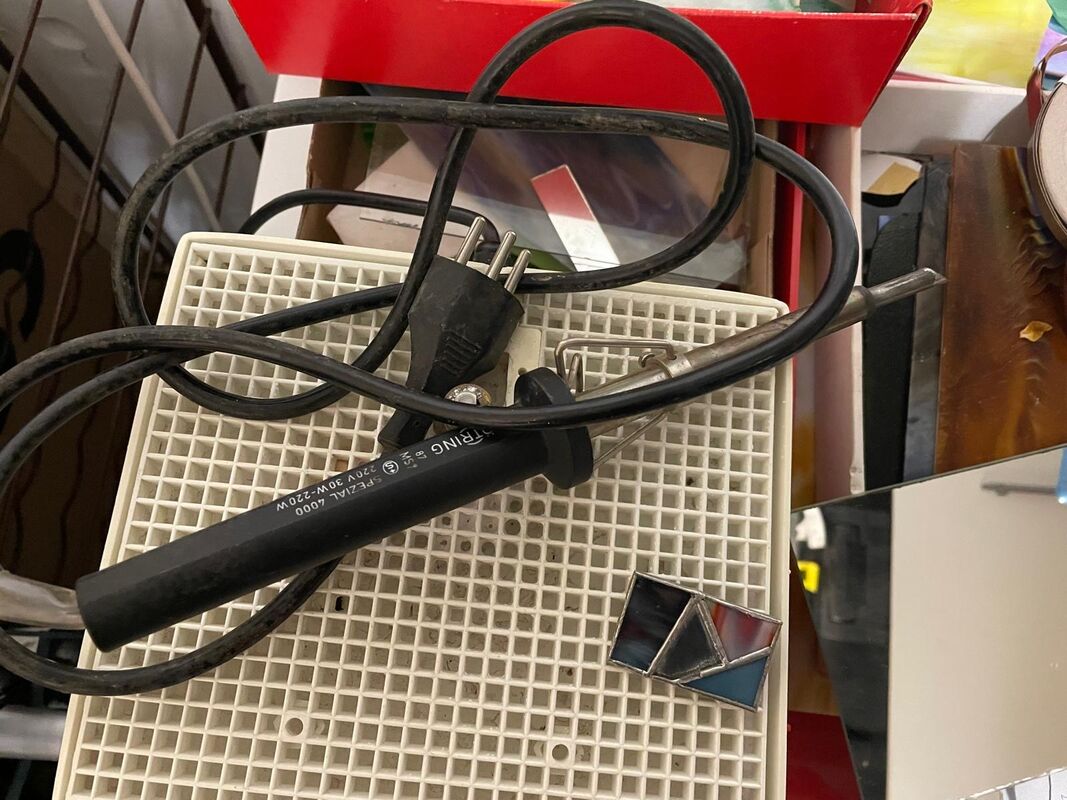 Glas in verschiedenen Farben und Grössen. Schleifmaschine, Lötkolben und andere Werkzeuge.