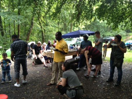 Mittlerweilen ist es später Nachmittag geworden und wir sind so richtig hungrig. Mitten im 'Aufstiegschrampf' treffen wir auf ein Fest unter afrikanischen Familien. Und welch ein Glück: Spontan werden wir zum Essen und Trinken eingeladen!