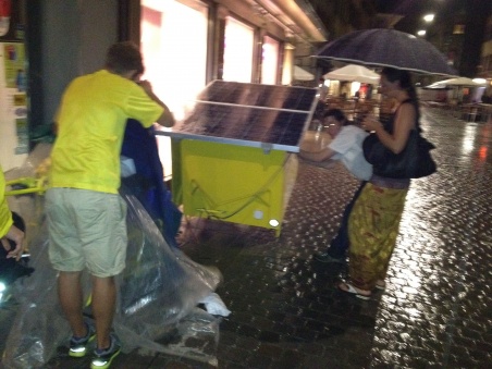 Zum Deichselbruch in Aarau. Am Abend kommen wir recht kaputt in Aarau an. Was für ein Pech: Die Zugvorrichtung unseres SolMobils ist gebrochen! Auch mit dem Wetter 'hapert es'. Während wir uns Hörnli kochen, beginnt es erneut zu regnen. Die Stimmung ist langsam im Keller. Der Tiefpunkt unserer bisherigen Tour ist erreicht.
