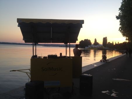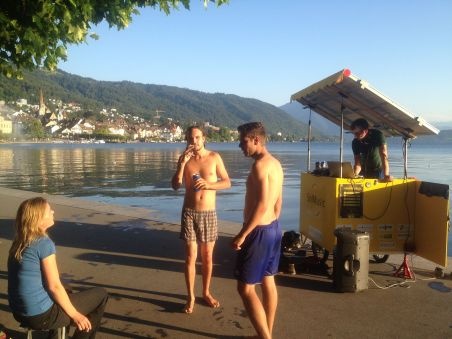 Dank der intensiven Sonne hatten wir voll aufgeladene Batterien, so dass wir das SolMobil am See aufstellen und ein spontanes Konzert veranstalten konnten. Bei mehreren Passanten erweckten wir ein grosses Interesse an unserem nachhaltigen Energie - Projekt, eine Musikanlage mit Solarenergie zu betreiben. Besonders freute es uns, dass wir eine ganze Gruppe junger Zuger für die Energie der Zukunft zu sensibilisieren vermochten. Ein Indischer Scheich war so beeindruckt von unserer Tour, dass er uns gar in seinen Palast nach Indien einlud!