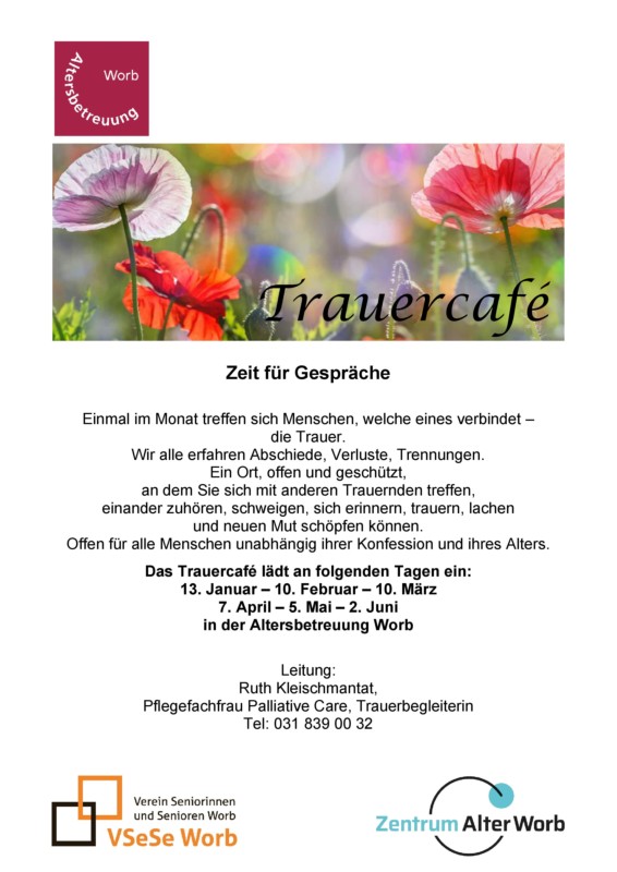 Einmal im Monat treffen sich Menschen, welche eines verbindet – die Trauer. Wir alle erfahren Abschiede, Verluste, Trennungen. Ein Ort, offen und geschützt, an dem Sie sich mit anderen Trauernden treffen, einander zuhören, schweigen, sich erinnern, trauern, lachen und neuen Mut schöpfen können. Offen für alle Menschen unabhängig ihrer Konfession und ihres Alters.