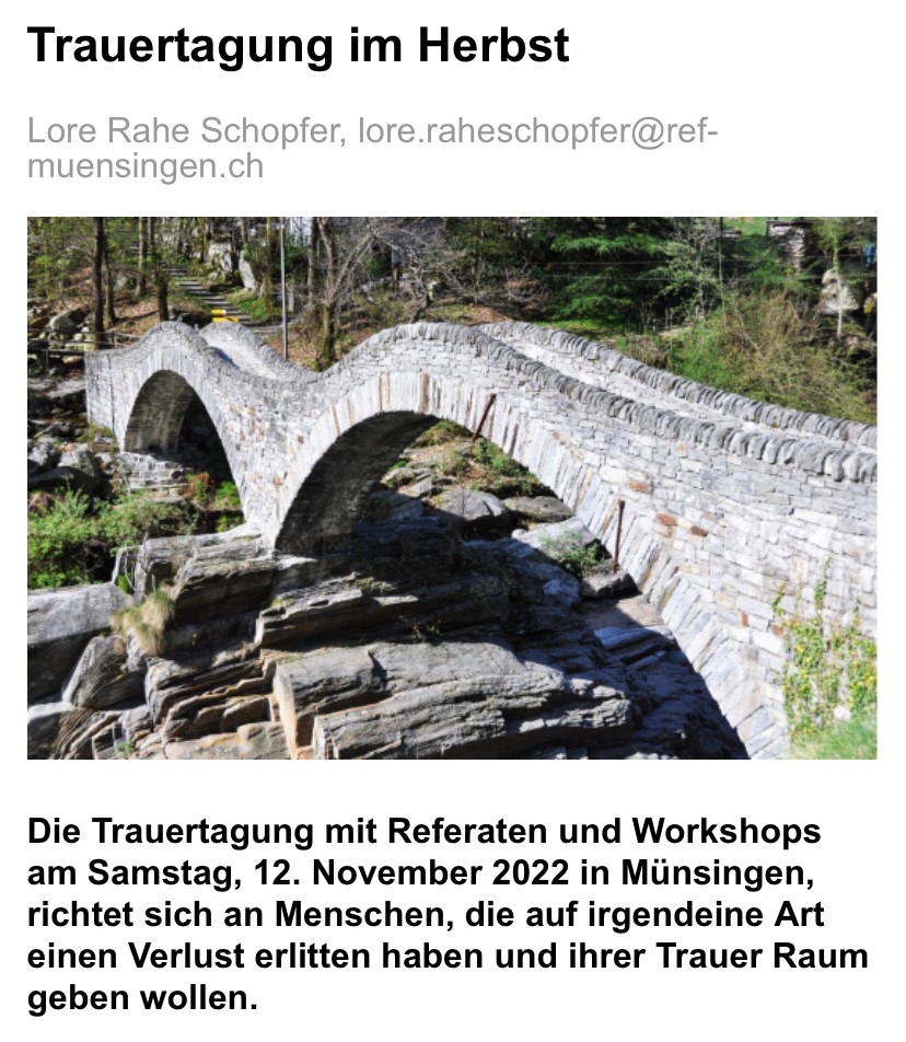 Dazu besteht die Möglichkeit bei der von C. Röthenmund (Trauerbegleiterin), J. v. Ah (kath. Theologin und Musiktherapeutin) und L. Rahe Schopfer (ref. Theologin) angebotenen Trauertagung.