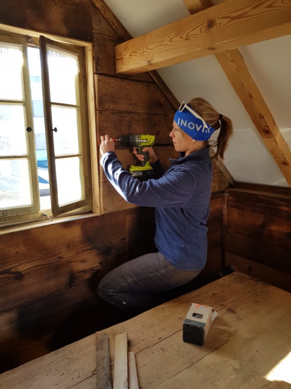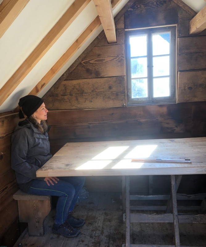 Nun hat sie es mit einigen Mitstreiter:innen ausgebaut. Von der Alphütte haben ein Fenster und eine Eckbank den Weg gefunden nach Oberdiessbach, ausserdem Bretter für die Innenverkleidung im Chaletstil. "Wir wollen etwas von der ursprünglichen Atmosphäre der Alphütte weiterbeleben."