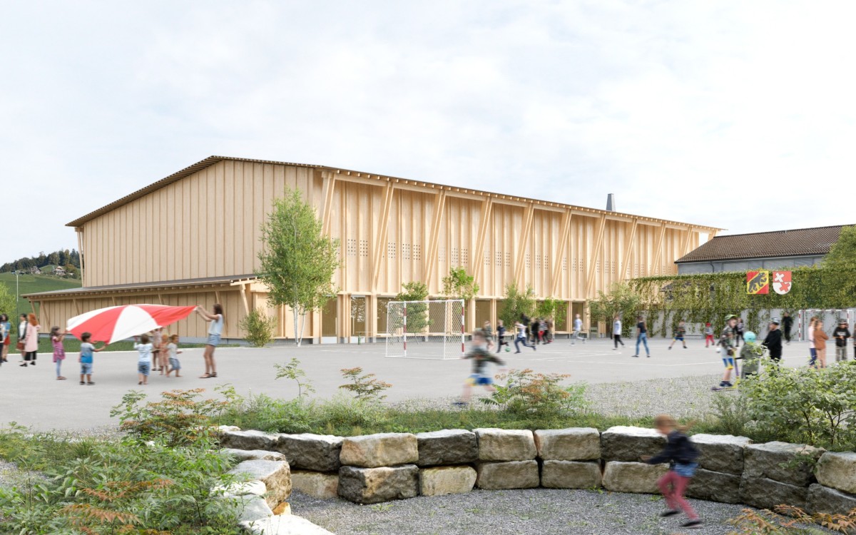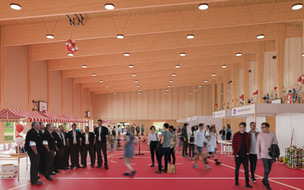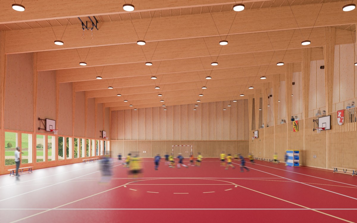 Darüberhinaus bietet die neue Halle alles, was eine zeitgemässe Turn- und Mehrzweckhalle braucht. Geräteräume innen und aussen, genügend Garderoben mit Tageslicht und Frischluft, grosse Fenster auf Sichthöhe mit Blick in die Landschaft, eine Zuschauer:innengalerie und ebenerdiger Zugang zu Vor- und Sportplatz. Auf ersteren führen grosse Tore, sodass er bei Grossanlässen nahtlos miteinbezogen werden kann. Die Halle kann zudem mittels Trennwände in drei kleinere Hallen unterteilt werden.