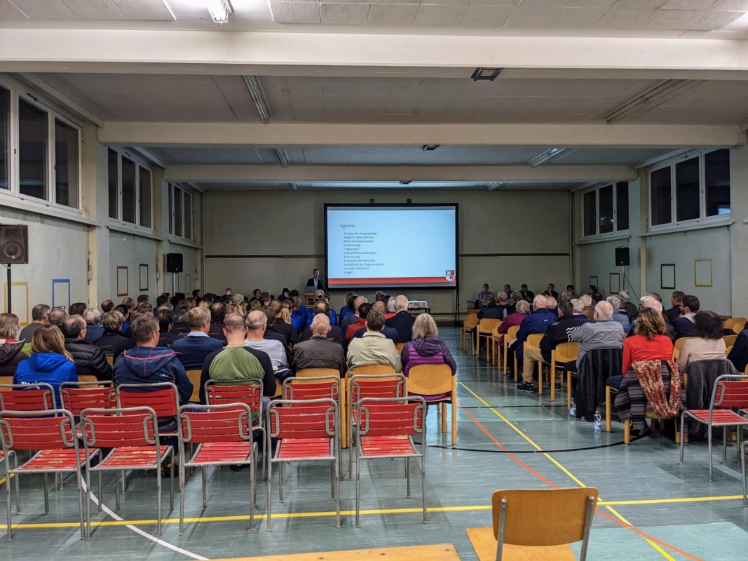 "Es wird eine schöne, grosse Halle und es passt zu unserer Region", so Heiniger zum Projekt. Es sei keine Luxuslösung, aber auch keine Billigvariante und biete mehr Vor- als Nachteile. Die dazu gezeigten Powerpointfolien schienen dies auch visuell deutlich zu machen. Jedoch geht es bei den zwei darauf aufgeführten Minuspunkten (gegenüber acht Pluspunkten) ums Geld: Für den Bau sollen die finanziellen Reserven angezapft und die Steuern von 1.75 auf 1.9 erhöht werden. Es braucht also an der Urnenabstimmung vom 27. November ein Ja zum Verpflichtungskredit und an der Gemeindeversammlung vom 2. Dezember eines zum Budget und zur Steuererhöhung.