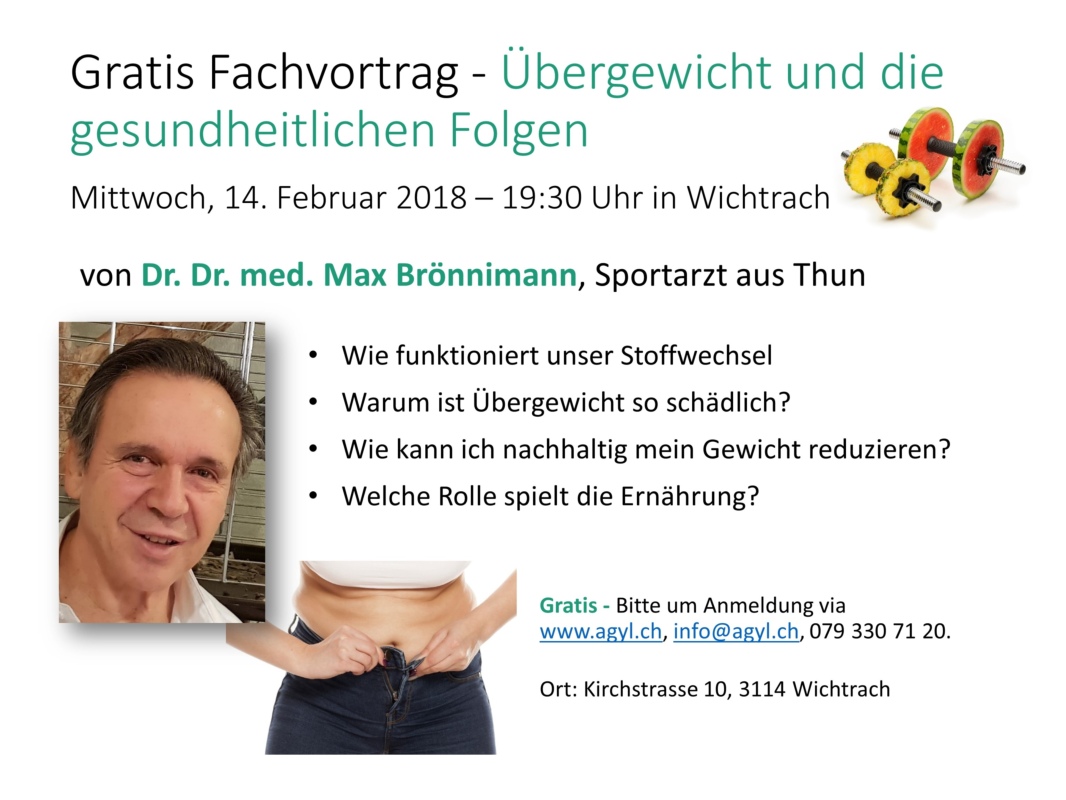 Am 14.02.2018 um 19:30 Uhr informiert Dr. Dr. med. Max Brönnimann im Mehrzweckgebäude in Wichtrach wie unser Stoffwechsel funktioniert, warum Übergewicht so schädlich ist, wie man nachhaltig das Gewicht reduzieren kann und welche Rolle die Ernährung und Bewegung dabei spielt.