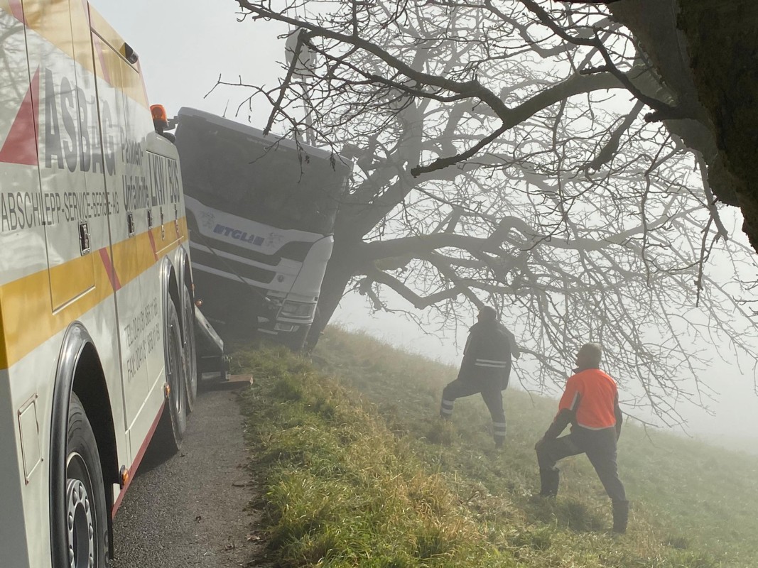 Der Unfall ereignete sich etwa um 7.15 Uhr. "Der Lastwagen wollte bei zwei Bauernhöfen eingangs Baldisthal die Milch abholen", berichtet Anwohnerin Esther Wüthrich. In einer Rechtskurve im Dürrenthan wurde dem LKW das Glatteis zum Verhängnis. "Das ist eine berühmt-berüchtigte exponierte Rechtskurve", beschreibt Wüthrich. Der Lastwagen sei links das Bordruntergerutscht, wo ihn ein Kirschbaum gestoppt habe.