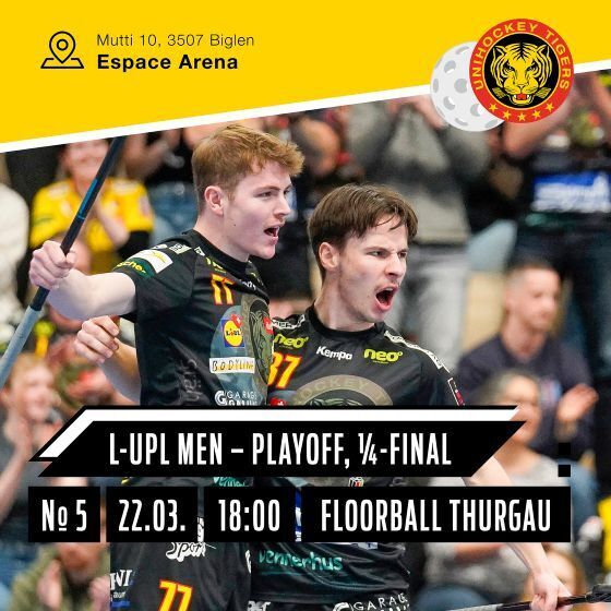 Wie sich die Ausgangslage für das 3. Heimspiel und 5. Spiel der Playoff-Serie gegen Floorball Thurgau gestaltet, entscheidet sich erst in Spiel 4 von Donnerstag Abend. Im besten Fall können sich die Unihockey Tigers den Halbfinaleinzug sichern. Ansonsten geht es für beide Teams um die 3:2 Führung und somit den 1. Matchball. Für Spannung wird also gesorgt sein. Kommt vorbei und unterstützt die Unihockey Tigers lautstark. Das Bistro ist wie üblich geöffnet. Wir freuen uns auf einen grossen Publikumsaufmarsch und eine fantastische Stimmung in der Espace! Heja Tigers!