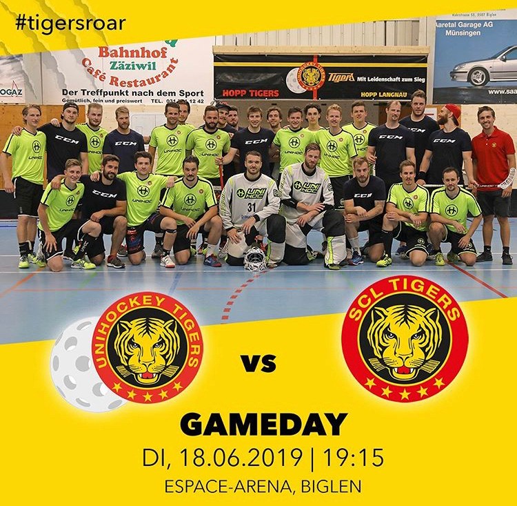 Am 18. Juni 2019 um 19:15 Uhr tritt die NLA Mannschaft der Unihockey Tigers gegen die SCL Tigers in der Espace Arena in Biglen an.