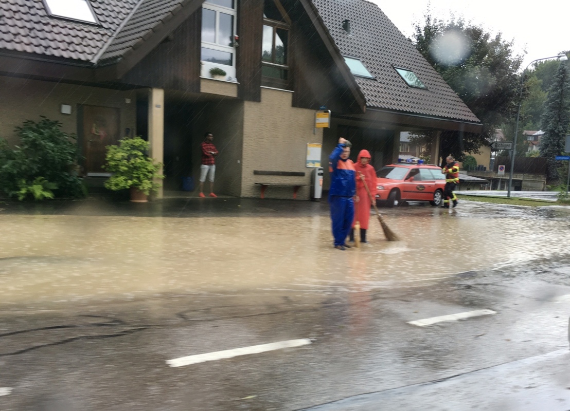Wasser im Keller meldeten die Grastrocknerei in Enggistein und Haushalte am Chutzenweg, an der Lindhaldenstrasse, am Bahnhofplatz und an der Enggisteinstrasse in Worb. Im Paschi in Enggistein drang Wasser in die Tenne ein und auch an der Rüttihubelstrasse in Enggistein drohte Wasser in ein Gebäude einzudringen.