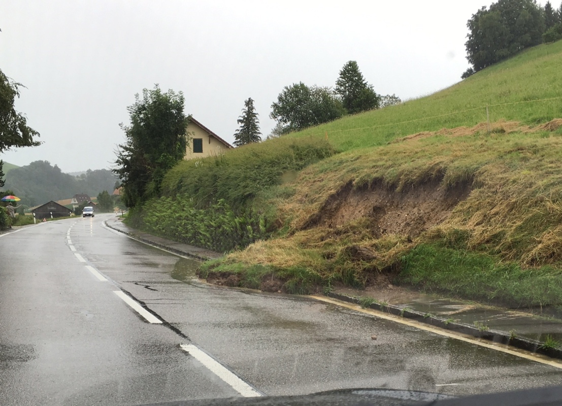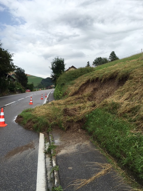 Zwischen der Grastrocknerei in Enggistein und dem Metzgerhüsi kam es zu einem Hangrutsch, welcher die Strasse teilweise unbefahrbar machte.