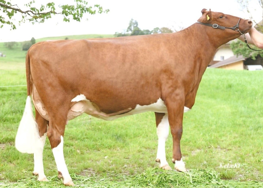 Die Kuh Eviana ist ein kleiner Champion. Wie sie so dasteht im Stall, sieht mein ungeübtes Auge ihr das nicht an. Beim zweiten Hinschauen fällt aber schon auf, dass Eviana eine mächtige Kuh ist. "Eviana stammt aus einer sehr erfolgreichen Zuchtreihe", erzählt Remo Bärtschi. Ihre Ur-Grossmutter Paulette war bereits eine aussergewöhnliche Kuh. Paulette gab in ihrem Leben 113'000 Kilogramm Milch. Und dies bis ins hohe Kuh-Alter von 15 Jahren.