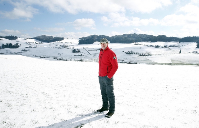 Andreas Flückiger schreitet durch den Schnee. Als er zuoberst auf dem Kunzberg ist, bleibt er stehen und blickt hinüber zum Bantiger. Der berühmte weiss-rote Sendemast dort ist knapp 190 Meter hoch. "Die Windturbinen hier würden ähnlich hoch", sagt er. Und fügt mit Nachdruck an: "Stellen Sie sich das einmal vor!"