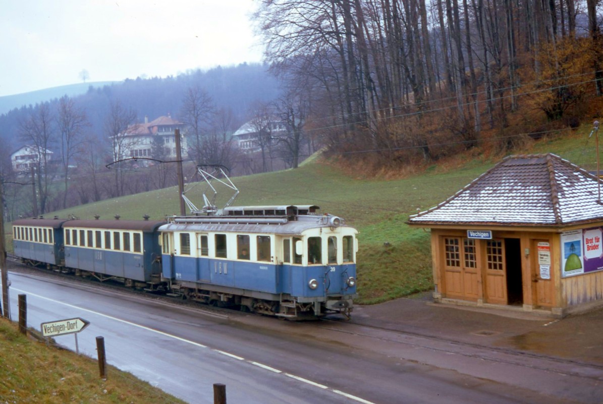 Es liegt noch ein wenig Schnee auf dem Stationshäuschen, während das blaue Bähnli in Vechigen einfährt. Ein Hauch Nostalgie umweht diese historische Aufnahme. BERN-OST wollte wissen, wie es heute dort aussieht.