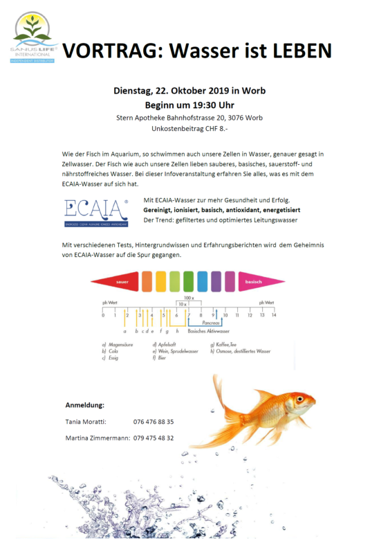 Wie der Fisch im Aquarium, so schwimmen auch unsere Zellen in Wasser, genauer gesagt in Zellwasser. Der Fisch wie auch unsere Zellen lieben sauberes, basisches, sauerstoff- und nährstoffreiches Wasser. Bei dieser Infoveranstaltung erfahren Sie alles, was es mit dem ECAIA-Wasser auf sich hat.