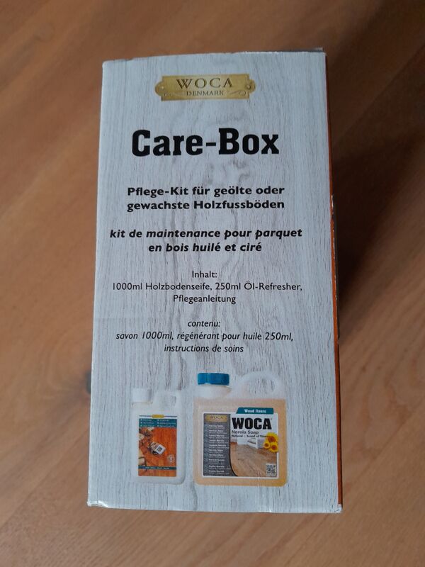 Mit WOCA vertrauen Sie dem weltweit führenden Holzpflege-Spezialisten. Die praktische Box ist das optimale Set zur perfekten Erstbehandlung geölter Parkettböden. Die neue Care-Box beinhaltet alles, was Sie für die Parkettpflege benötigen und erleichtert Ihnen so den Einstieg in die Holzbodenpflege.