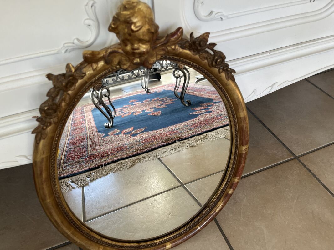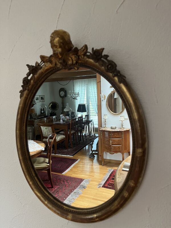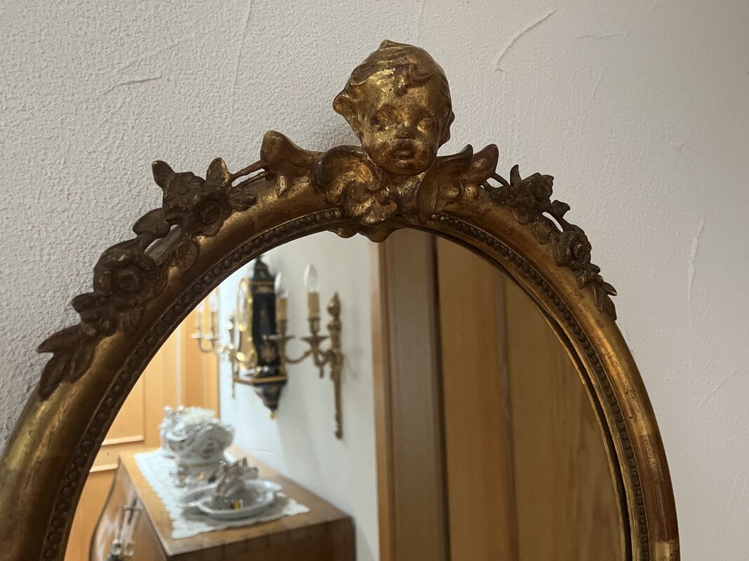 Antiker ovaler Goldwandspiegel mit Holzrahmen und Engel. In sehr schönem Zustand, ohne Mängel!
