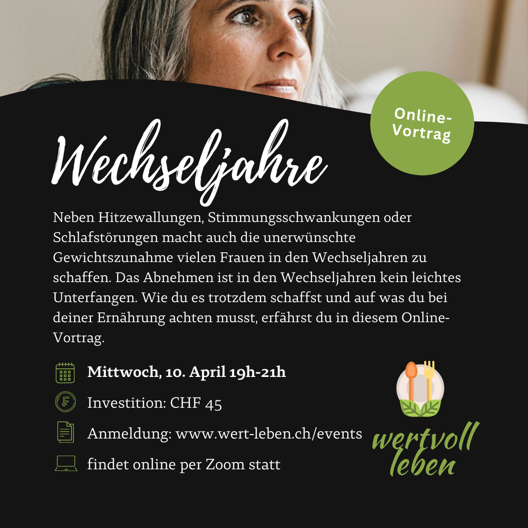 Neben Hitzewallungen, Stimmungsschwankungen oder Schlafstörungen macht auch die unerwünschte Gewichtszunahme vielen Frauen in den Wechseljahren zu schaffen. Das Abnehmen ist in den Wechseljahren kein leichtes Unterfangen. Wie du es trotzdem schaffst und auf was du bei deiner Ernährung achten musst, erfährst du in diesem Online-Vortrag.