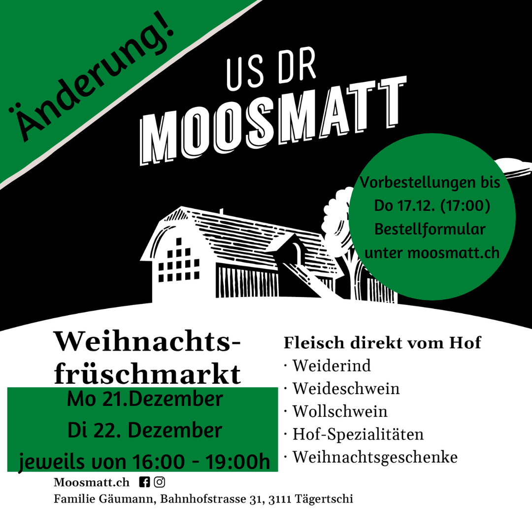 Ausserdem gibts verschiedene Hof-Spezialitäten, verschiedenste Weihnachtsleckereien und Weihnachtsgeschenke zu kaufen. Chinoise und Bourguignonne-Platten können vorbestellt werden. Auch die meisten anderen Produkte können vorbestellt werden. Die Bestellliste finden Sie unter moosmatt.ch.