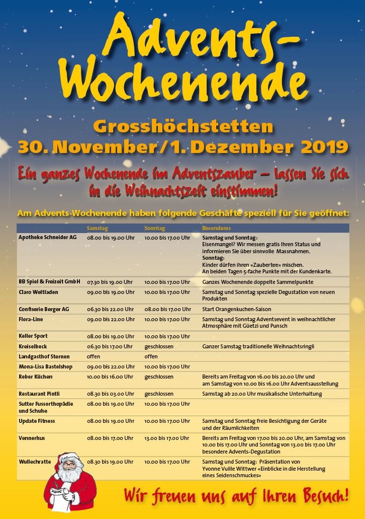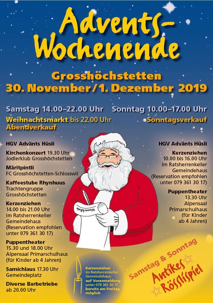 Ein ganzes Wochenende im Adventszauber - lassen Sie sich in die Weihnachtszeit einstimmen! Viele verschiedene Marktstände erwarten Sie an unserem Weihnachtsmarkt vom Samstag, 30. November 2019. Für die Kinder stehen die Angebote Rösslispiel, Kerzenziehen und ein Puppentheater zur Verfügung. Ausserdem wird uns der Samichlaus um 17.30 Uhr auf dem Gemeindeplatz besuchen.