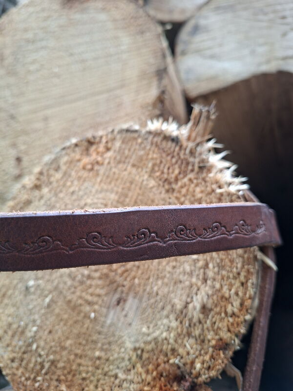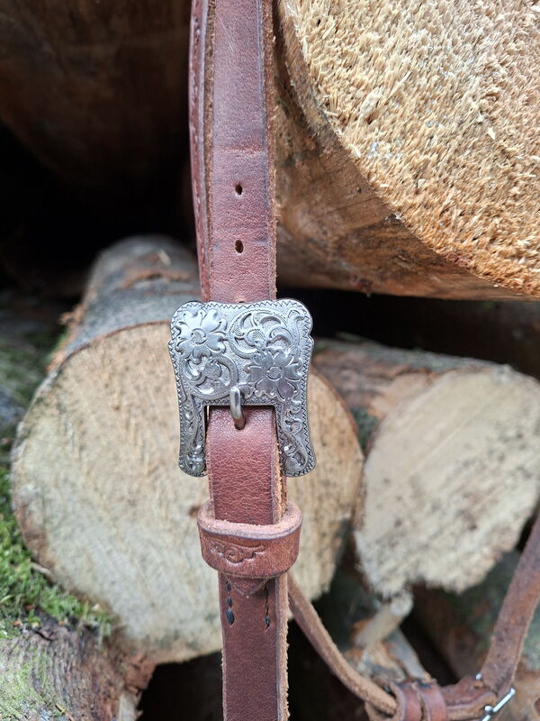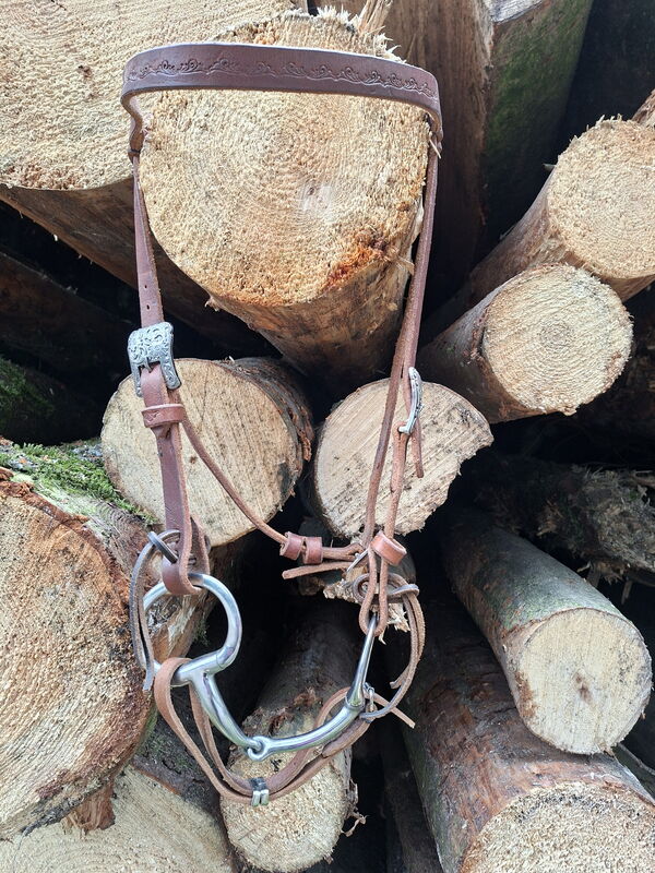 Westernzaum, komplett von Hand genäht, Grösse für einen Freiberger, sehr weiches Fettleder, 1 x dunkelbraun, 1 x mittelbraun mit Punzierungen. Mit Kinnriemen (ohne Gebiss).