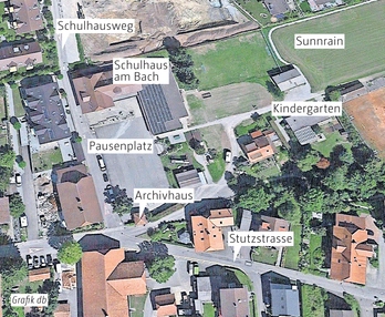 In einem Schreiben an den Gemeinderat zeigt der Architekt gleich selber auf, wie die Erschliessung auch geregelt werden könnte. So schlägt er etwa vor, den Kindergarten direkt neben das Schulhaus Bach zu verlegen. So wäre das Schulareal konzentrierter und die Zufahrt könnte an deren Rand vorbeiführen. Dazu müsste aber das Archivhaus um rund sechs Meter verschoben werden.