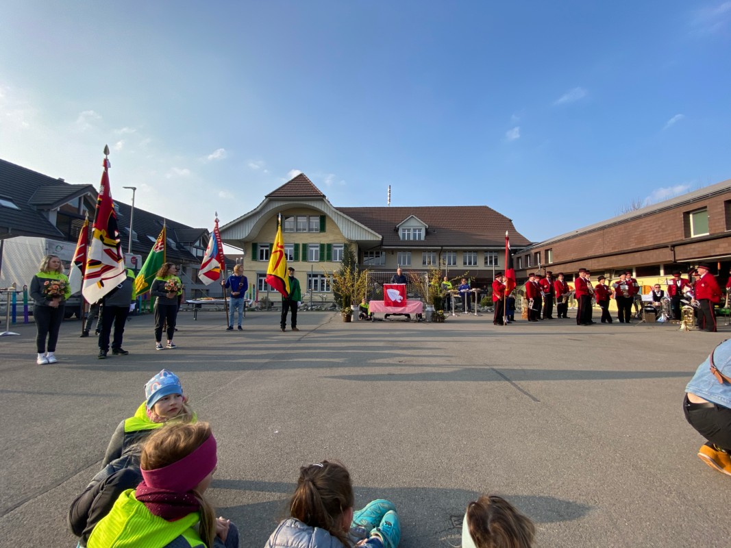 Bis zur Fahnenweihe wurde die neue Fahne strikte geheim gehalten. Am Samstag wurde sie dann beim Bahnhof enthüllt und anschliessend in einem Umzug zum Schulhaus am Bach getragen. Dort gab es einen feierlichen Akt.