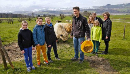 Da nützt alles Rufen nichts. Die Galloway-Rinder auf der Weide in Wichtrach stellen sich taub. Erst als Bauer Daniel Krieg einen Kessel mit Maiswürfeln zeigt, kommen sie angerannt, rammen die Köpfe in den Kessel und fressen gierig. Die Zuschauer – unter ihnen die Stadtfamilie Judith Bärtschi, Heiner Aebischer mit den Töchtern Anna Lea und Sarah – lachen. Um sie herum gackern weisse und braune Hühner. Sie gehören der 12-jährigen Lea, Tochter von Marinette und Daniel Krieg-Stucki. Das Ehepaar hat vor einem Jahr den Hof an der Wilstrasse von den Schwiegereltern Silvia und Andres Stucki übernommen, auf Bio umgestellt und die Milch- gegen Mutterkühe ausgewechselt. Jetzt bieten sie Stadtfamilien Besuche auf dem Hof an. Aebischer Bärtschis sind die Ersten, die sich angemeldet haben (siehe unten).