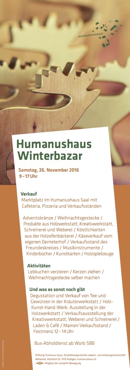 Verkauf von Produkten aus unseren Werkstätten und vom eigenen Demeterhof / Ausstellung in der Holzwerkstatt, Kreativwerkstatt, Weberei und Schreinerei / Verpflegung und Degustation