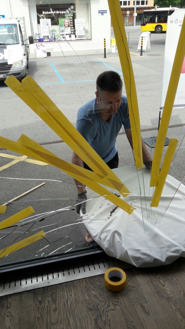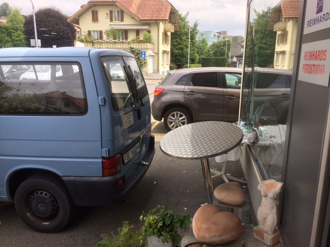 Ein Lieferwagen-Fahrer vergass am Samstag Nachmittag, bei seinem Fahrzeug die Handbremse anzuziehen. Das Fahrzeug machte sich selbständig und landete im Schaufenster von BERN-OST.