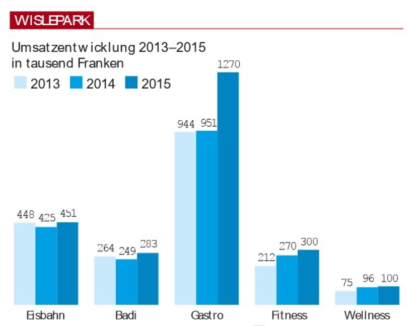 Das Restaurant, die Curlinganlage sowie der Fitness- und Wellnessbereich des Wisleparks werfen Gewinne ab. Einen Teil davon erhält die Gemeinde, erfahrungsgemäss rund 50 000 Franken pro Jahr. Die Umsätze in diesen Bereichen sind in den vergangenen Jahren gestiegen, am stärksten im Gastrobereich (siehe Grafik). «Wir sind bestrebt, immer neue Anlässe und damit auch neue Leute in den Wislepark zu holen», erklärt Rolf Nöthiger. «Das zahlt sich aus.»