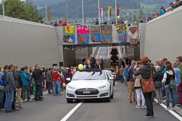 Um 17 Uhr hat das Warten dann ein Ende. In einem langen Tross fahren unzählige Elektroautos – kleine unscheinbare neben grossen teuren Teslas – als erste Fahrzeuge die gesamte Strecke der neuen Umfahrungsstrasse ab. Begleitet werden die Autos von der Feuerwehr, es wird gehupt und gewinkt.