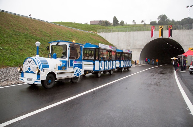 Nach vier Jahren Bauzeit ist die Umfahrungsstrasse eröffnet worden. Die Bevölkerung konnte die Strasse zu Fuss oder in einem Minizug in Augenschein nehmen, bevor die Umfahrung dem Verkehr übergeben wurde.