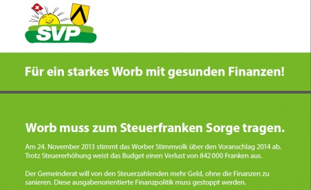 Die SVP Worb lehnt den Voranschlag 2014 mit einer Steuererhöhung um einen Zehntel ab. Die entsprechende SVP-Medienmitteilung trägt den Titel "Zum Steuerfranken Sorge tragen - Für ein starkes Worb mit gesunden Finanzen". Die SVP wirbt mit einem Flugblatt an alle Haushalte für ein Budget-Nein.