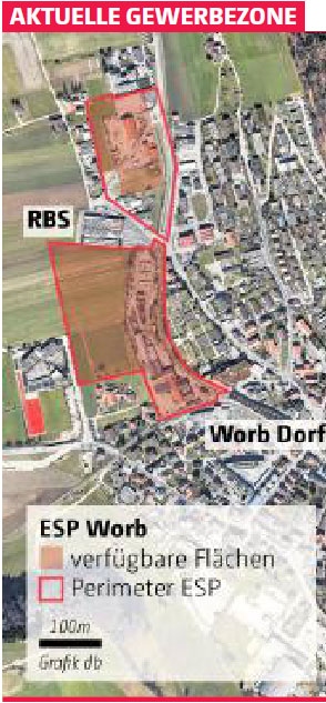 Der Worbboden ist seit über zwanzig Jahren ein kantonaler Entwicklungsschwerpunkt (ESP). 3000 Arbeitsplätze sollten dort geschaffen werden, lautete die Prognose. Wie bei anderen ESP im Kanton haben sich die Hoffnungen in Worb nicht erfüllt. Zwar siedelten sich im Gewerbehaus an der Bollstrasse und in weiteren Gebäuden kleinere Firmen an. Der grosse Wurf gelang aber nicht, mehrere unbebaute Flächen sind leer geblieben.