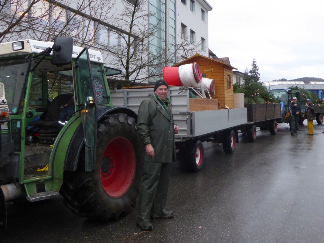 Eine Tanne um die andere haben Mäder und seine Helfer mittlerweile von den beiden Anhängern abgeladen und auf dem Platz verteilt. Auch Mäders sechsjähriger Sohn Lenn hilft mit. Unermüdlich schleppt er einen kleinen Tannenbaum nach dem anderen durch den strömenden Regen. Sorgfältig stellt er sie in die Halterungen und rennt dann zurück, um ein neues Bäumchen abzuholen. Auch Mäders Mitarbeiter tragen Baum um Baum zu den Halterungen. Wohl gegen die 150 Stück stehen am Ende auf dem Platz, so genau hat Mäder sie nicht gezählt.