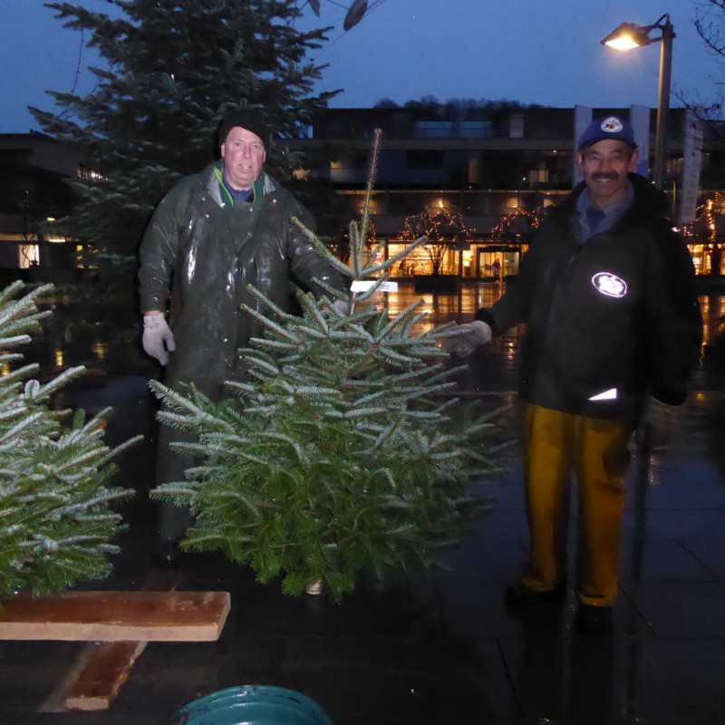 Es dämmert schon langsam, als alle Bäume an ihrem Platz stehen. Heimelig umrahmen sie die grosse Gemeindetanne, deren Lichterkette inzwischen angegangen ist. Hell funkeln die Lichter durch die Regentropfen. In anderthalb Stunden hat sich der kahle Bärenplatz in einen kleinen Tannenwald verwandelt. Der alljährliche Weihnachtsbaumverkauf kann losgehen.
