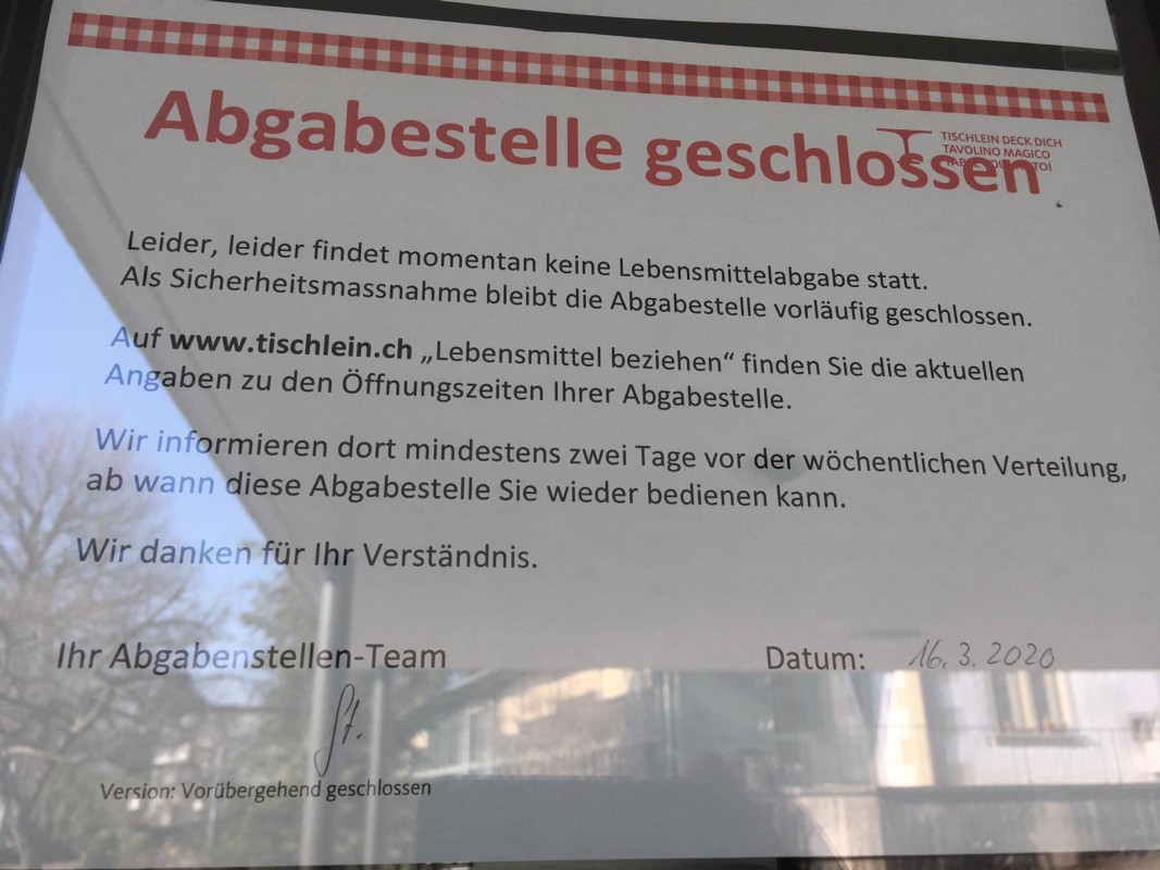 Der Entscheid zur Schliessung der Abgabestellen sei zum Schutz der Freiwilligen von Tischlein deck dich sowie der Kundinnen und Kunden, schreibt der Verein in einer offiziellen Mitteilung. Bis zum 19. April finden definitiv keine Abgaben von Lebensmitteln mehr statt. Danach werde man zwei Arbeitstage im Voraus eine Wiedereröffnung kommunizieren. Informiert wird über den Anschlag bei der Abgabestelle sowie online. "Da wir keine Kontaktdaten haben, können wir es den Kundinnen und Kunden nicht direkt mitteilen", erklärt Zwahlen.