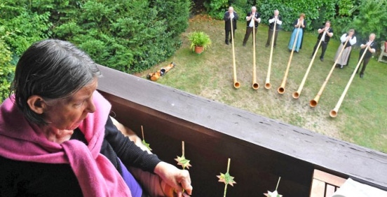 Durch einen Aufruf im «Forum» fand sich die Berner Alphorngruppe Niesengruess. Die Musikerinnen und Musiker besuchten das Ehepaar Riesen daheim und gaben, in Tracht und Chüjermutz gekleidet, ein halbstündiges Mittagskonzert. Jeannine-Yvonne Riesen konnte vom Balkon aus den Klängen lauschen und wurde von ihrem Mann bewirtet. Sie schwärmt: «Ich habe mich sehr über das Konzert gefreut, und die Musik hat mich berührt.» Auch Paul Riesen ist überwältigt: «Die Gruppe hat sich so bemüht, dass die Überraschung bestens gelungen ist. Es war eine grossartige Leistung.»