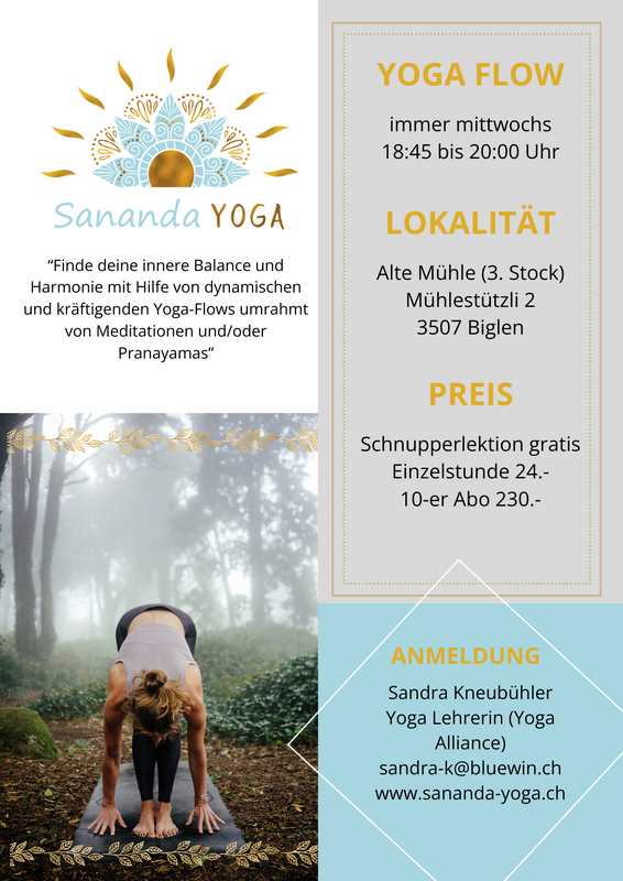 Als Alliance zertifizierte Yogalehrerin unterrichte ich jeden Mittwochabend von 18:45 Uhr bis 20 Uhr Vinyasa Yoga in der alten Mühle in Biglen.