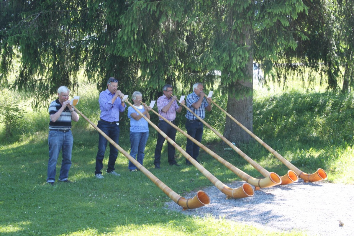 Nach dem ersten, vielleicht schon zweiten Raclette wurden die Gäste durch die Alphorngruppe 3+2 Chonufinge überrascht. Das Alphorn-Quintett begeisterte die Anwesenden mit dem archaischen, eigentümlichen Instrument und seinen Naturtönen. Harmonisch und gekonnt präsentierten die Alphornbläser so auch den passenden Titel «Us-em Bärnbiet». Walter Iseli erklärte den Gruppennamen: «zu uns drei, Res Brechbühl, Herrmann Peter und mir sind nun mit Annemarie Dällenbach und Hansruedi Gammenthaler zwei weitere ambitionierte Alphornbläser gestossen.»