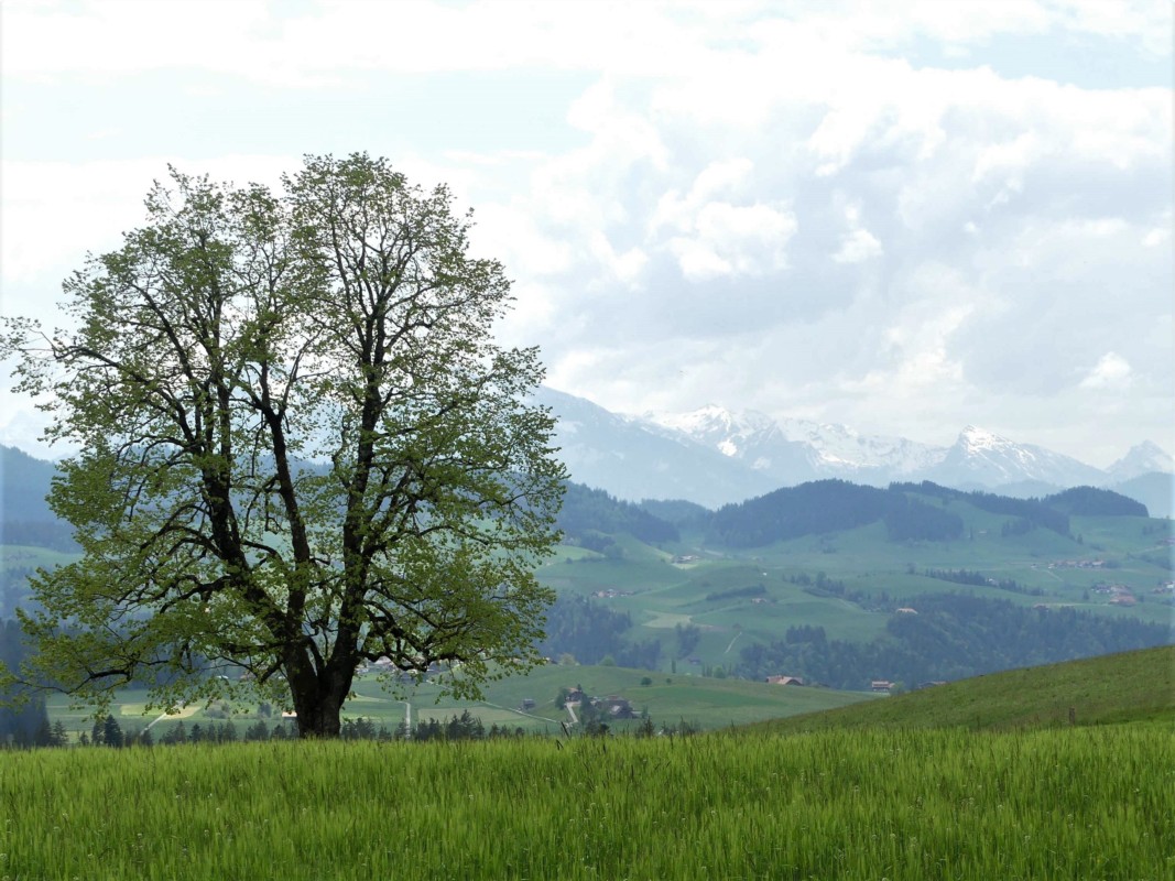 Rudolf von Tavel beschrieb die Gegend mit folgenden Worten: "Das stille Land hinter der Fluh, wo Berner Oberland und Emmental über harte Nagelfluhkämme hinweg, in verschwiegenem Tann, die Hand sich reichen". Über den Süderenhubel und Schnabel erreichte die grössere Gruppe Neuhaus. Mit einem Abstecher durch den Brüscherewald erreichten sie den Aussichtspunkt Wachseldornhubel. Auf 1'033 Meter genoss die Gruppe den Stundenhalt mit der Aussicht von der Schrattenflue über die Honegg und die Hochalpen bis zur Stockhornkette.