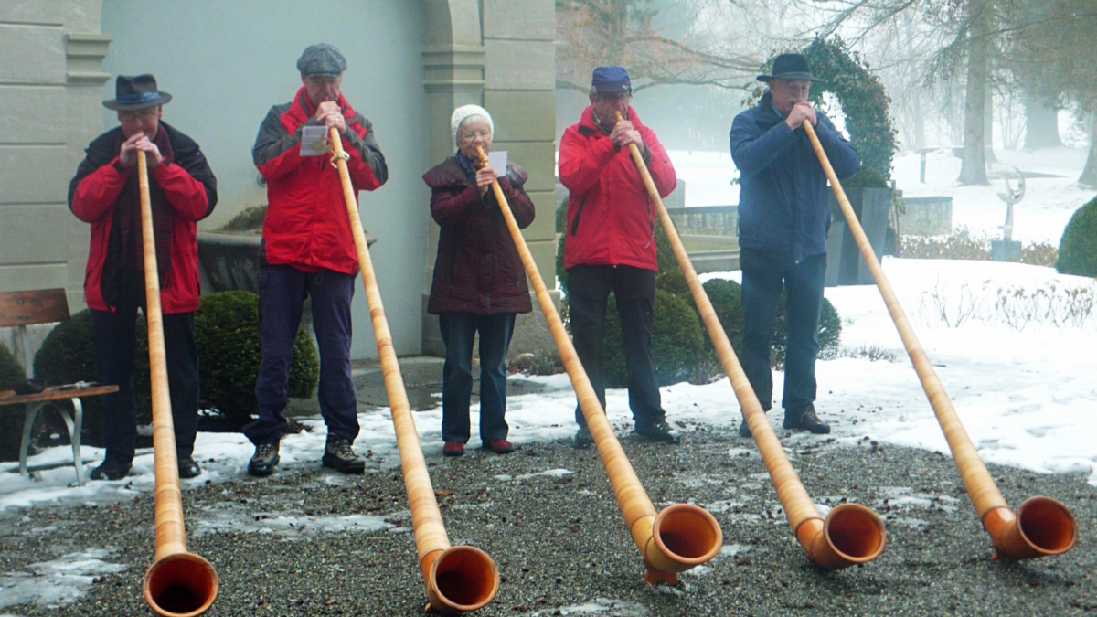 Nach dem „Stalden-Adventure-Trip“ empfing das Alphornquintett mit Res Brechbühl, Annemarie Dällenbach, Hansruedi Gammenthaler, Walter Iseli und Hermann Peter die muntere Schar, die Dauerregen, Matsch und Eis getrotzt hatte. Auch wenn das Wetter nicht mitmachte wie üblich, Mina Bühlmann genoss ihren 84. Geburtstag ebenso wie alle anderen.
