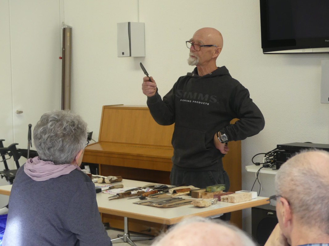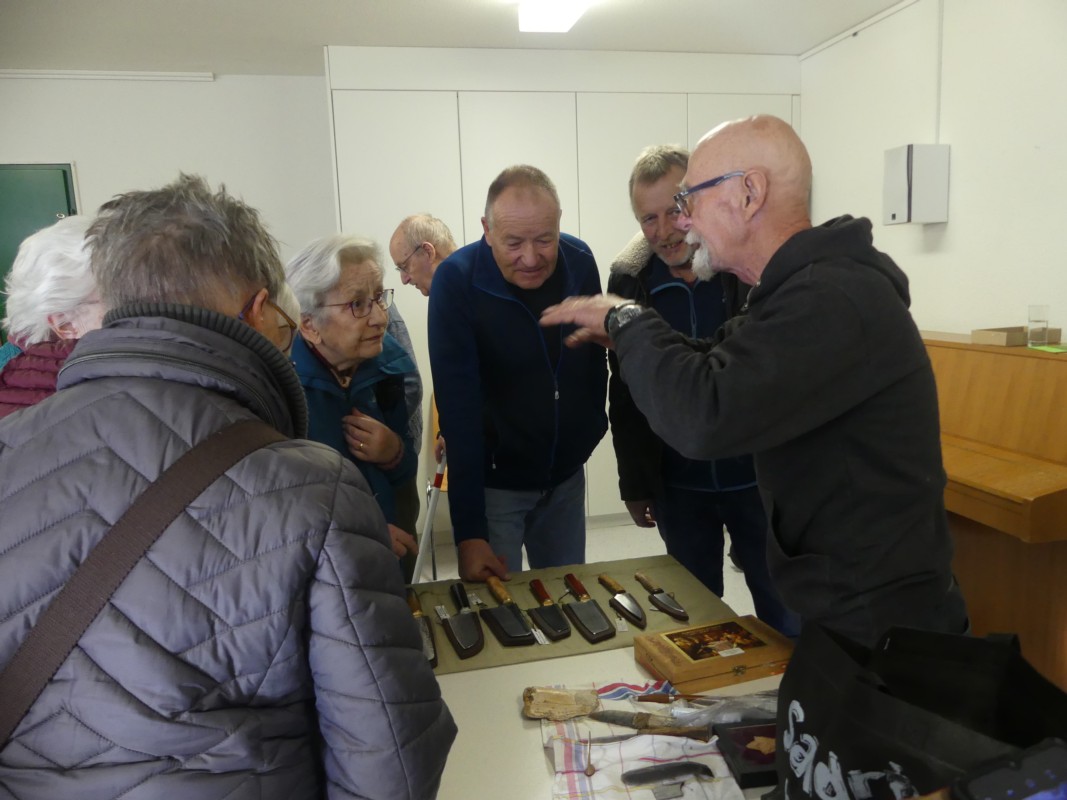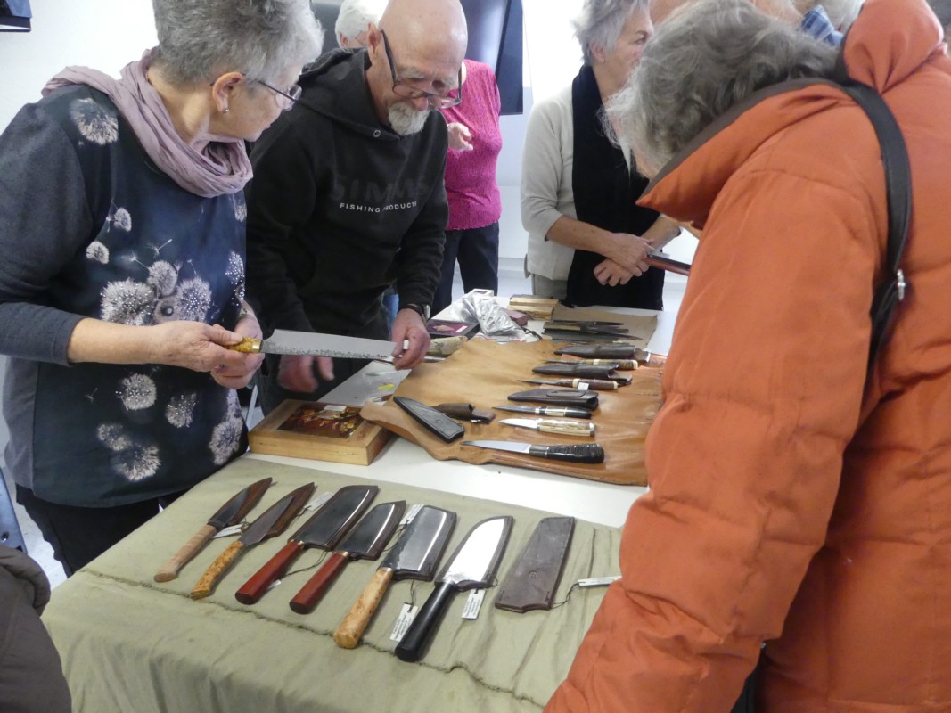 "Den Stahl, meist Damaststahl bringe ich in die Form mit erwärmen, schmieden, abkühlen, wieder erhitzen bis ich das Gewünschte erhalten habe". Viel länger als mit dem Herstellen von Messern habe er am Anfertigen von Schutzhüllen getüftelt. "Bei der Gerberei Zeller in Steffisburg – sie bearbeitet das Leder wie vor über hundert Jahren vollumfänglich auf natürliche Weise – fand ich das pefekte Leder, um auch meine Hüllen selber zu erstellen". Der hochinteressante Vortrag war auch noch Gesprächsthema beim abschliessenden Umtrunk im Bistro des Alterszentrums Lebensart in Konolfingen.
